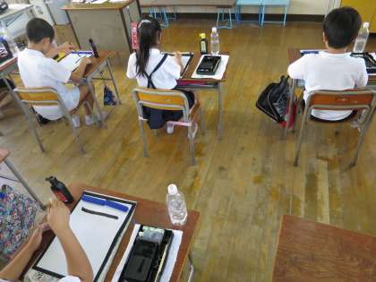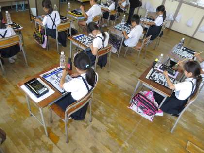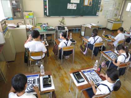 初めての習字の時間です。準備の仕方や道具の使い方を学習した後は、いよいよ墨で挑戦です。線や○など、持ち方に気を付けながら書いてみました。