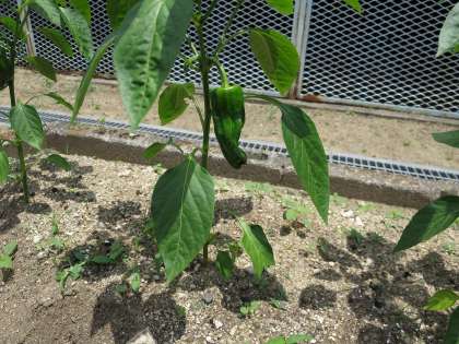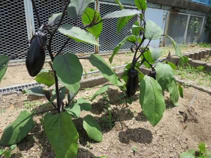 運動場のプールの横の学習園の野菜、きゅうりやピーマン、なすびができてきました。つやつや輝いています!収穫が楽しみになりますね。