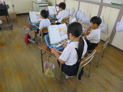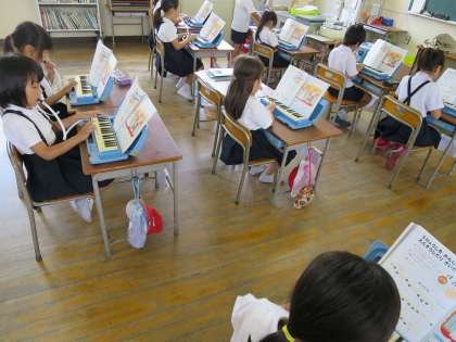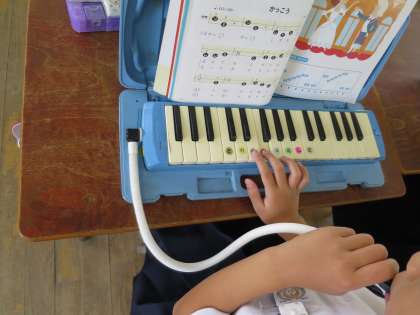 けんばんハーモニカで「かっこう」「かえるのうた」を練習していました。先生の伴奏とみんなの音色がピタッとそろっていました!
