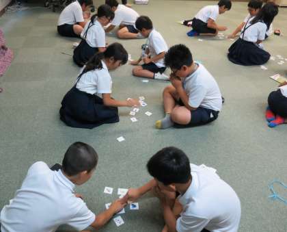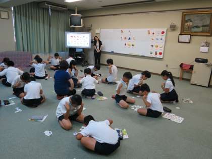 外国語活動で、I like〜. を学習しました。チャンツのリズムで何度も繰り返して練習した後に、ペアでカードゲームをしました。カードを取りたくて取りたくて!!白熱のゲームでした。