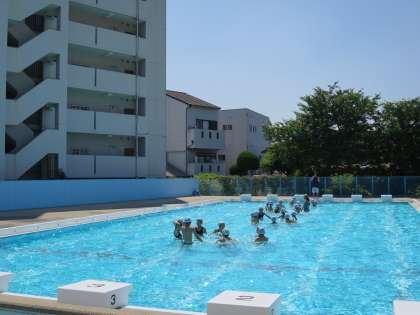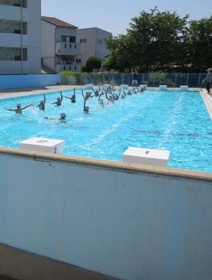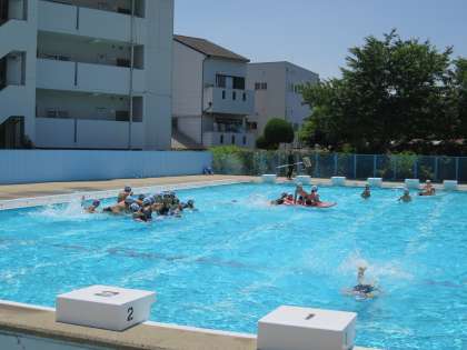 リズム泳をしたり、けのびやクロールの練習、また泳力測定もしました。最後の自由泳では、キラキラ輝く太陽の下で楽しく遊びました!