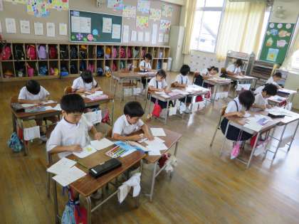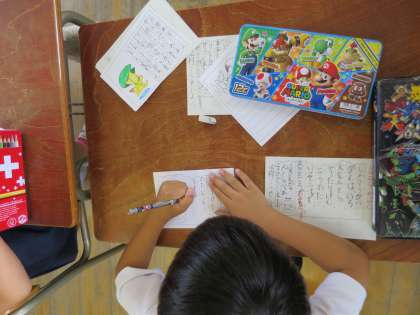 2時間目に、町探検でお世話になった方々にお礼のお手紙を書いていました。カラフルに色もぬっています。気持ちが伝わるね!