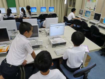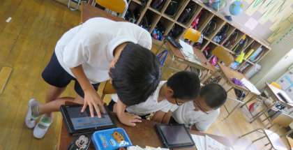 「ヒトは、母親の体内でどのように育って誕生するのか」を、パソコンやタブレットを使ってグループで調べました。グループであれこれと相談しながら進めていました。