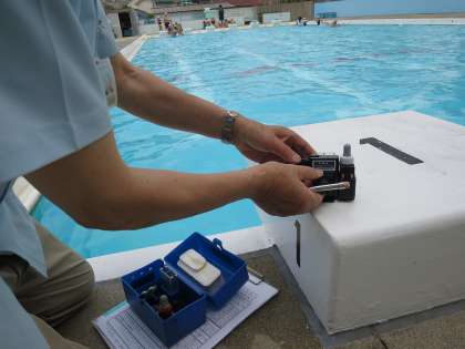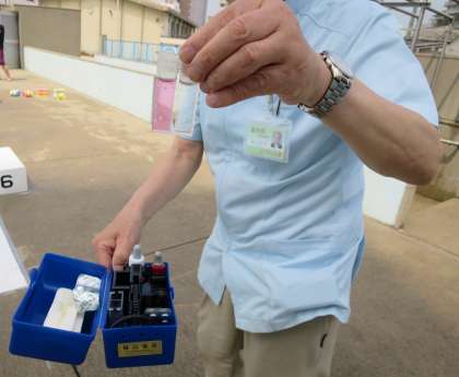 学校薬剤師の先生によるプールの水質検査がありました。残留塩素濃度(ピンク色)やphの検査(緑色)などを行いましたが、結果は良好とのことでした。