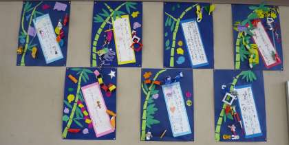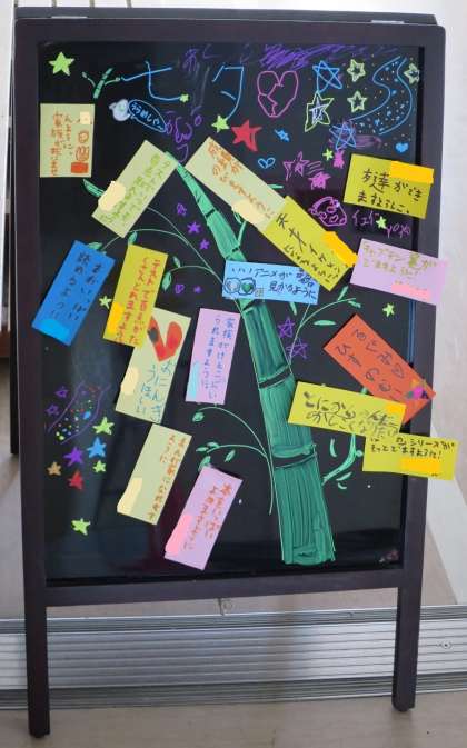 今日は、七夕です。教室や廊下の掲示板には、子どもたちが作った七夕かざりが掲示されています。願い事を書いた短冊も!願いがかなうように、がんばろうね\(^o^)/