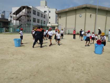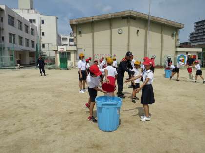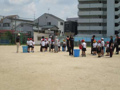 保護者の方々、地域の方々、区役所の方々、消防署の方々にも来ていただいて、防災教室を行いました。今日、学習したことを、いざという時にいかせるようにしたいものです。写真は、バケツリレーの様子です。