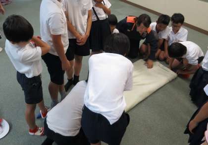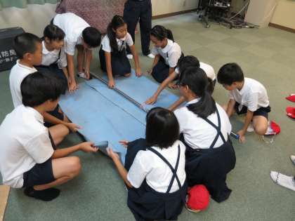 多目的室では、応急処置体験を行いました。ひもやビニル袋といった身近にあるものを使った応急処置、また毛布を使った担架も体験しました。