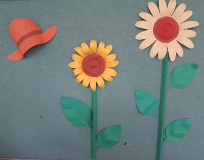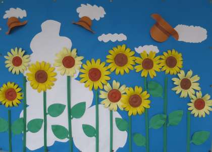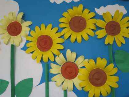 広報委員会の児童みんなで作った作品が、職員室前の掲示板に掲示されています。色々なパーツを組み立てて、ひまわりの立体作品が完成しました。きれいで色鮮やかで、夏を感じます!