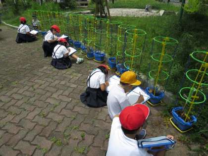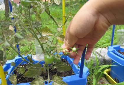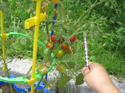 ミニトマトの観察をしました。実は、いくつなっているかな?実の大きさや色は?葉はどんな大きさかな?など、観察したことを記録しました。小さな実、大きな実、赤い実、緑の実、いろんな実がありましたね。