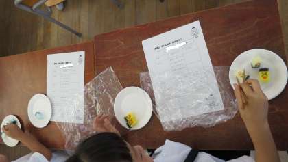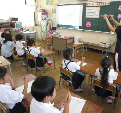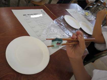 食育の研究授業がありました。おはしを正しく持つことの良さを考え、実際に小さく切ったスポンジを使い、おはしを正しく持ってつかむ練習もしました。
