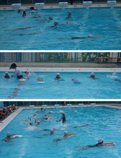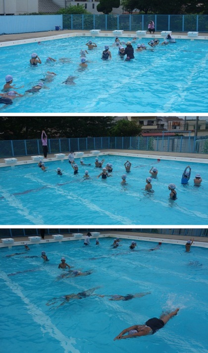 小学校の水泳学習にも慣れてきた1年生。「浮く」「もぐる」ができるようになってきました。