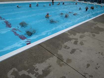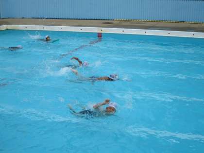今日は、32名が参加しました。気温も水温も高く、気持ちよかったです。水慣れや水遊びの後は、コース別に分かれて25mをクロールで泳いだりやビート版を使ったり、バタ足だけで進んだりと、自分の目標に向かってがんばりました。そして最後は、自由時間!キャッキャッと笑顔もいっぱい楽しそうでした。