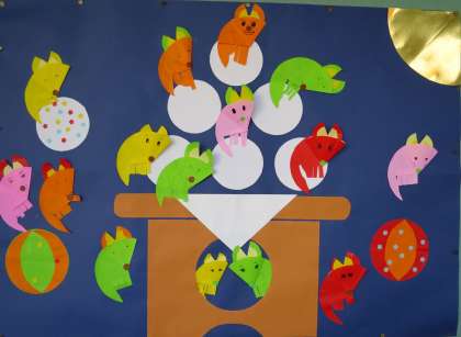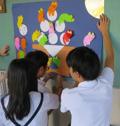 今日の委員会で作った作品を掲示しました。色々な色のかわいいきつねたちが楽しそうにお月見をしています。折り紙をうまく折って作っていますね!表情もかわいいです。