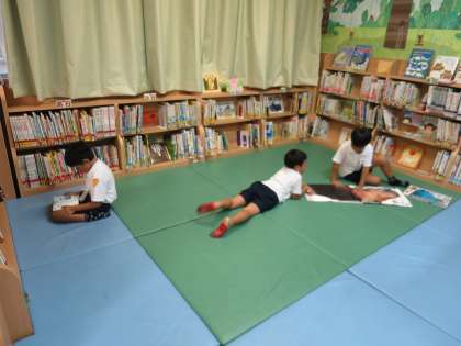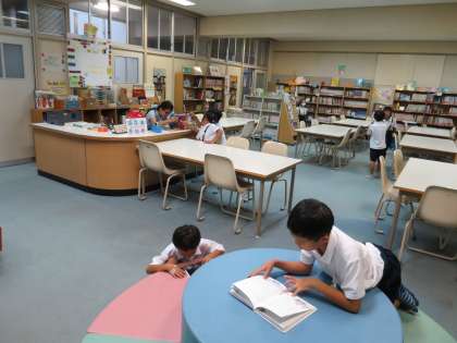 10分休みの図書開放にも、子どもたちがはりきってやって来ます。少しの時間でも読書をしたい!本が好きなんですね。思い思いの場所でお気に入りの本を見付けて読書を楽しんでいました。