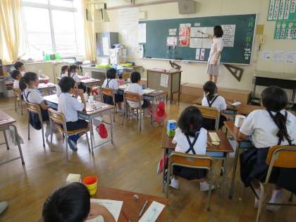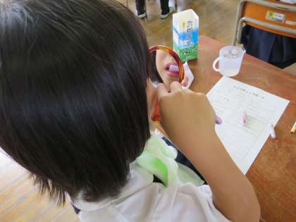 教育委員会の先生をゲストティーチャーにお迎えし、歯みがき指導をしていただきました。前歯を1本だけ赤く染めだししたり、鏡を見ながら色々なみがき方で歯みがきの練習もしました。