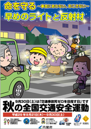 今日、9月21日(木)〜9月30日(土)までは、「秋の交通安全週間」です。今年も、子どもを交通事故から守る事。お年寄りを交通事故から防ぐ事を中心に全国で安全運動が展開されます。本校も、10月6日に生野警察の方を招いて、交通安全指導を実施します。因みに、上図は、今年の「全国交通安全運動」のポスターです。皆さんも、一人一人、交通ルールを守り、交通マナーを心掛け、交通事故の防止に努めてほしいと思います。