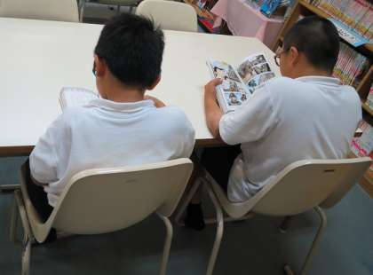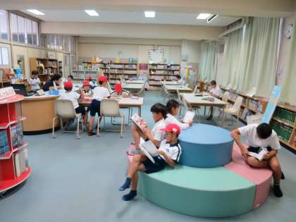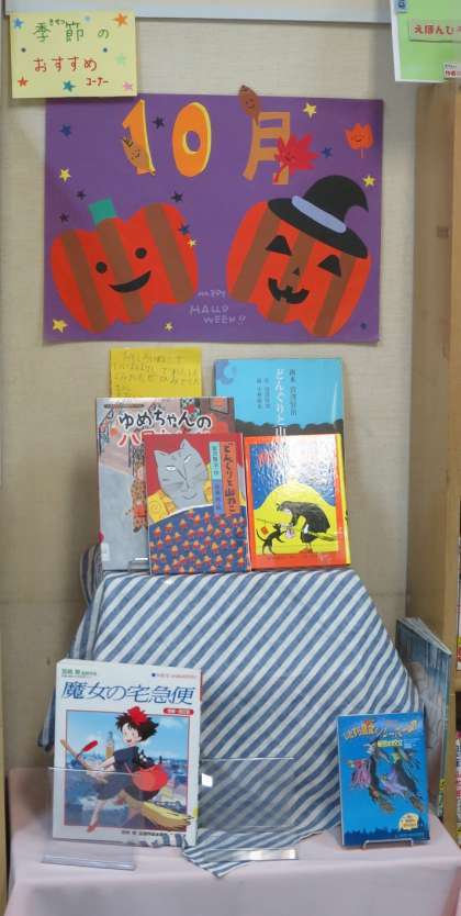 雨のため、図書室に本を読みに来る児童が多かったです。お気に入りの場所で、すっかり本の世界に入ってもくもくと読んでいる姿が印象的でした。掲示物やおすすめの本なども10月のものに変わっていて、わくわくがいっぱいの図書室です。