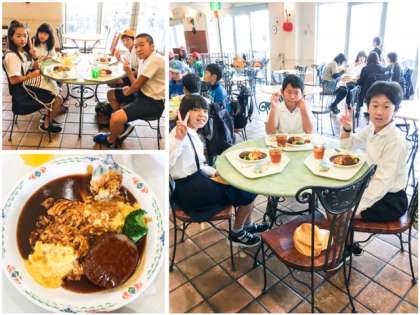 スクールメニューチケットを使って、お昼ごはんです。チケットをなくしてしまった子はいないよね? +50円でライスを大盛りにできるメニューもあるとか。うれしいシステムです!