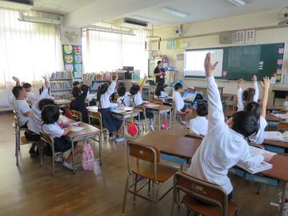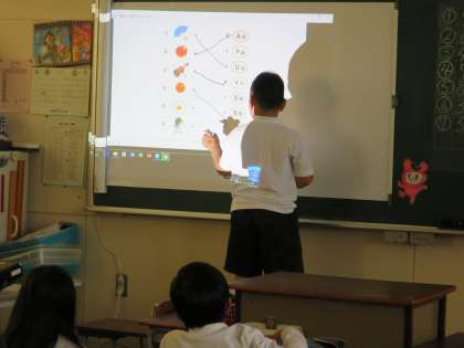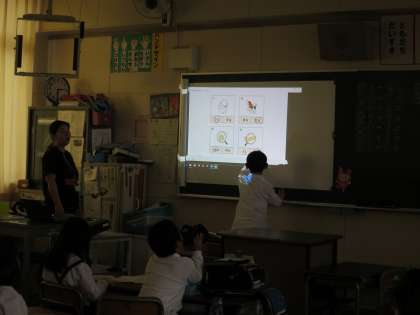 今朝のイングリッシュタイムは、ラウンドクイズに挑戦しました。音声で流れる単語の発音を聴いて、どの文字で始まるかという文字当てです。継続することは大事ですね。文字認識がみんな完璧(*^_^*)すごい!!