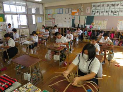 かご作り!集中して編んでいます。基本の編みに、色を加えていくとぐっと個性が増してきますね。みんなきっちり確実に編み続けています!!