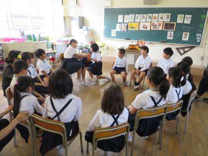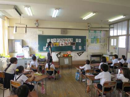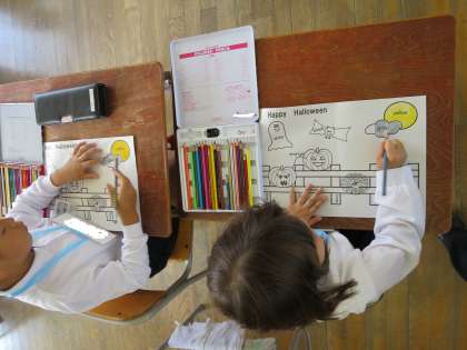 もうすぐハロウィンです。今日の英語の時間は、ハロウィンについて学習しました。「Trick or treat」や「Happy Halloween」といいながらパンプキンを運ぶゲームをしたり、色の学習もしてハロウィンのぬり絵をしたりしました。