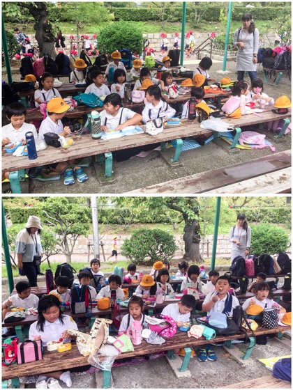 前半の見学終了。待ちに待ったお弁当タイム! 見学中から「おなかがへったー!」の大合唱だった模様。たんと召し上がれ!