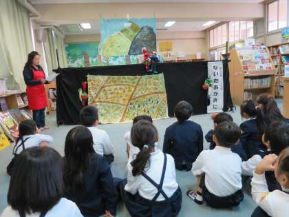 生野区更生保護女性会「くるみ座」の皆様に来ていただき、「おおきなかぶら」と「ないたあかおに」の指人形劇を楽しませていただきました。また、指人形の操作の仕方も体験させていただきました。初めての体験にみんな嬉しそうでした。ありがとうございました。