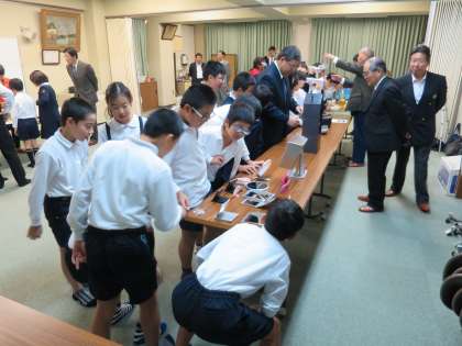 ゲストティーチャーに大阪府鏡工業協同組合の方々をお迎えし、生野区の地場産業の鏡について学習させていただきました。目の前で、薬品を化学反応させて透明の液体から鏡に変化する様子を見せていただいたり、いろいろな鏡を手に取らせていただいたりと、子どもたちも興味津々でした。一番下の写真は、実験の結果コーヒーの瓶が鏡に変化したものです。ありがとうございました。