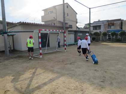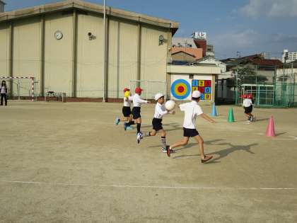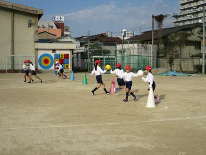 たてわり班対抗で、「ボールサンドリレー」を楽しみました。二人がペアになって片手でボールをはさんで運びます。落としてもまたそこから!運営委員で協力して準備や片付けもがんばっていました。