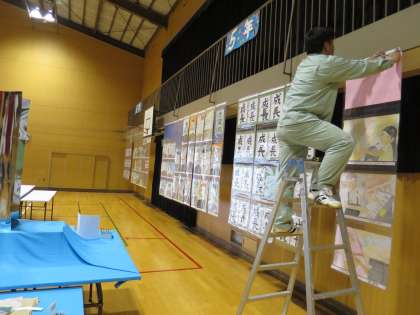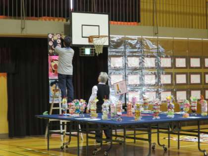 明日からの作品展に向けて、朝から準備をしました。絵画作品は、校長先生と教頭先生と管理作業員さんが掲示してくれました。工作作品は、子どもたちが嬉しそうに運んできました。講堂いっぱいに一人一人の作品が並んでいます!明日からの作品展、どうぞお楽しみに。