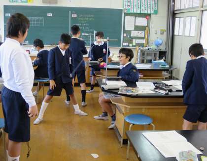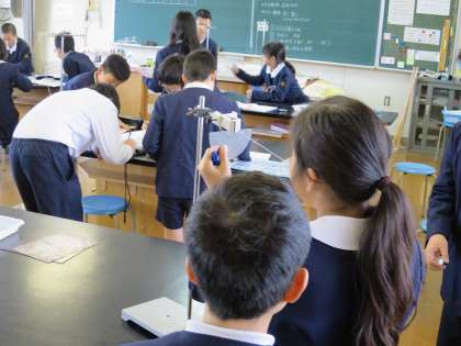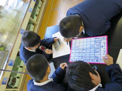 今日のふりこの実験は「ふれはばを変えると1往復の時間の速さはどうなるか?」です。分度器で角度を測って、ストップウォッチを持って実験スタート!班で役割を分担して実験を進めることができていました。