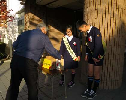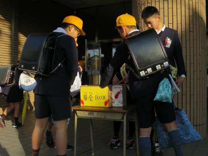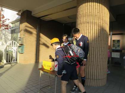 今週は、毎朝の登校時に児童会の児童が正面玄関で募金を呼びかけています。募金を呼びかけていると、早速子どもたちや先生方が募金をしてくれました。