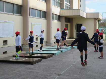 今日は、元気っ子パークの中庭での様子をお知らせします。中庭では、竹馬や一輪車、なわとびに取り組んでいます。失敗しても、またそこからがんばっています!