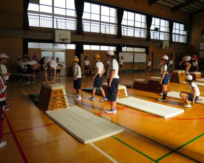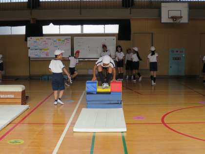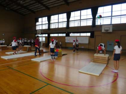 先週に続いて、合同体育を行いました。「大きな開脚」「かかえ跳び」ができるように、ステップをつんで練習に取り組みました。