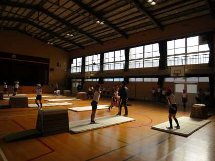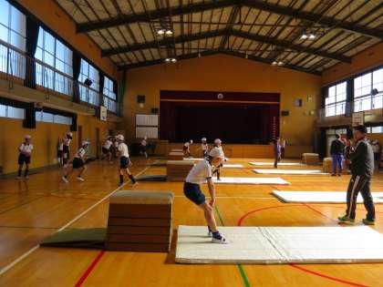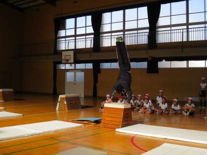 倒立や開脚跳びを中心に、うまくなるポイントをたくさん教えていただき実践しました。最後に先生のすばらしい技を次々に見せていただき、みんな大感動でした。ありがとうございました。