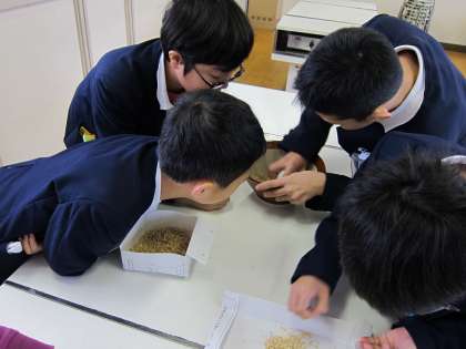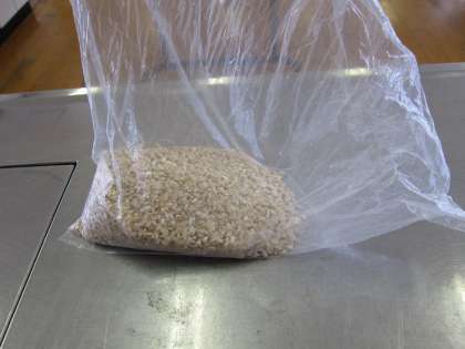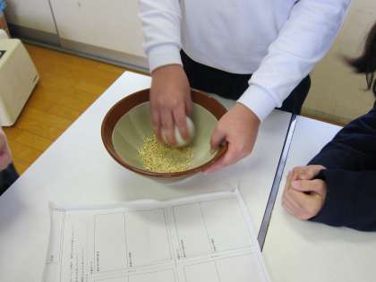 収獲したお米をすり鉢と軟球を使って玄米にしました。米粒がつぶれないように慎重に!みんなで協力して200グラムくらいの玄米にしました。さあ、次は調理実習です。