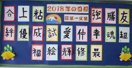 正面玄関には5年生の作品が掲示されています。今年の目標を漢字1文字で表して毛筆で書いています。さて、どんな意味が込められているのかな?