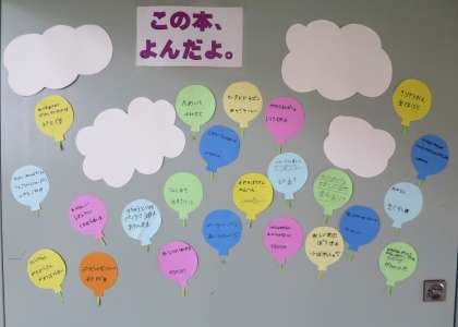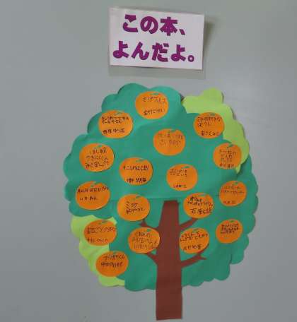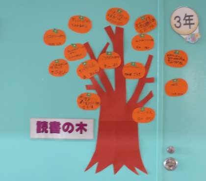 全学年で、おすすめの本を紹介し掲示をしています。1年生は風船、2年生はみかん、3年生は柿の実に書いています!図書館支援員の先生が準備してくださいました。ありがとうございます。