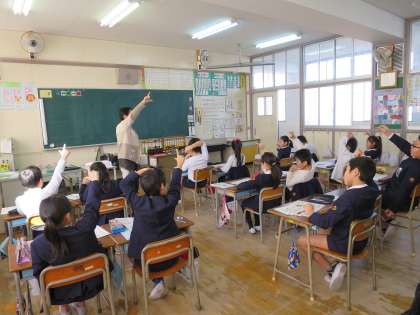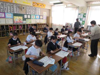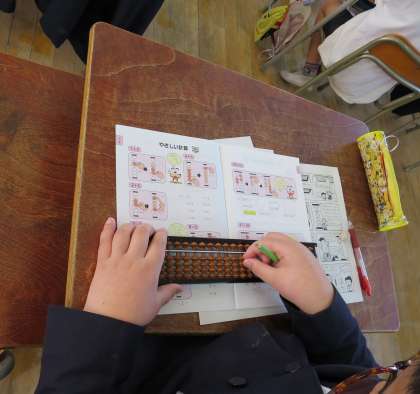 初めてのそろばん学習の日です。そろばんの先生が、基本となる姿勢や指使い、珠のおきかたなどを教えてくださいました。早速、たし算にも挑戦しました。珠をはじくいい音が聞こえてきました!