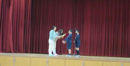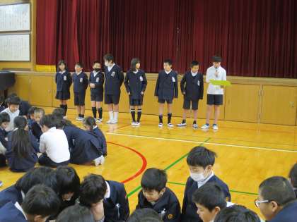 今週は、給食週間です。今朝の児童朝会では、給食の歴史を聞いたり食べ物クイズをしたり、給食調理員さんに感謝の気持ちを込めてお手紙を渡したりしました。いつもおいしい給食をありがとうございます。