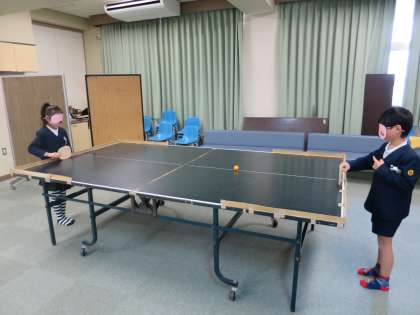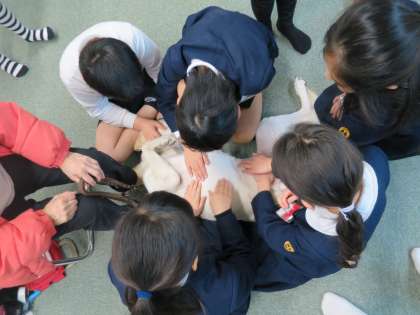 視覚障害をおもちの方と、盲導犬のフェリシアちゃんをゲストティーチャーにお迎えし、盲導犬やゲストティーチャーの方の生活の様子などについて教えていただきました。フェリシアちゃんと触れあったり、サウンドテーブルテニスも体験させていただきました。