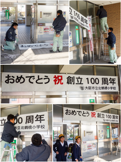 「おめでとう 祝 創立100周年」の文字がデザインされた、長さ4mほどの横断幕。2人の管理作業員さん(本校のMさんと、区内の中学校から応援で来てくださったYさん)が、高さやバランス、張り具合を何度も確認し、風の影響等を考えながら、慎重に取り付けてくれました。