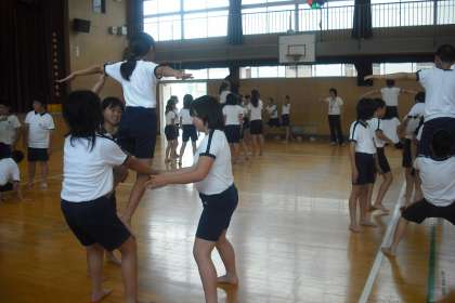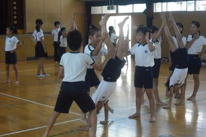 しっかりとストレッチを行い、体を十分慣らした後は、片手で全身を支える技やブリッジにも取り組みました。その後、サボテン・逆立ちなどの組になって行う技では、6年生が数人ずつ5年生のチームに入って、コツなどを教えてあげていました。補助の仕方や手の持ち方など、ポイントをおさえて声掛けをしていて、さすがだなあと思いました。