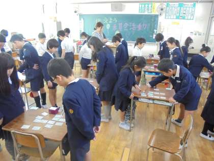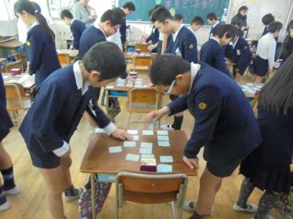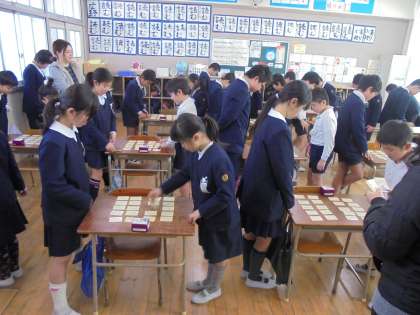 3年生と5年生が百人一首で対決しました。1対1で真剣勝負です!さて結果は・・・さっそく次回の対決も約束したそうです。