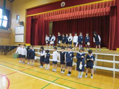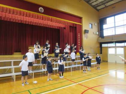 入学式で、新1年生のために行うお祝いの催しの練習が始まりました。初日の今日は、3回ある隊形移動の練習です。どのタイミングでどのように移動するのかを何度も練習しました。覚えたかな?