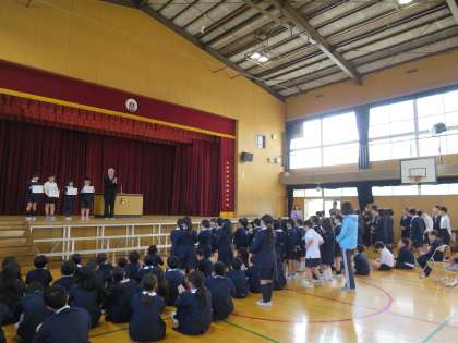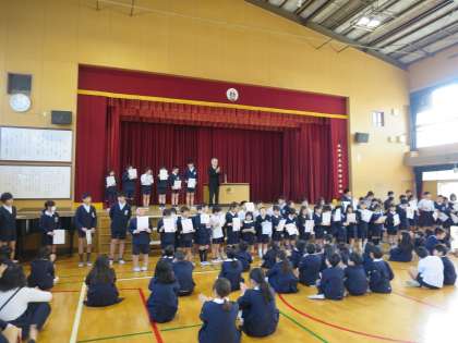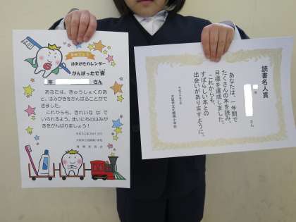 児童朝会で「読書名人賞」と「歯みがきがんばったで賞」の表彰がありました。がんばった多くの児童が表彰されました。ダブル受賞の児童もたくさん!嬉しいね(*^_^*)