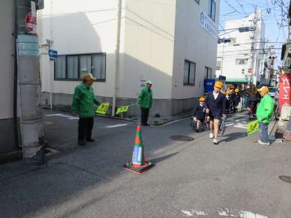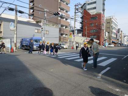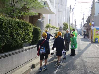 北鶴橋子ども見まもり隊、防犯北鶴橋支部の方々、おまわりさん、校長先生に見守られて元気に登校してきました。いよいよ新学期が始まりました。