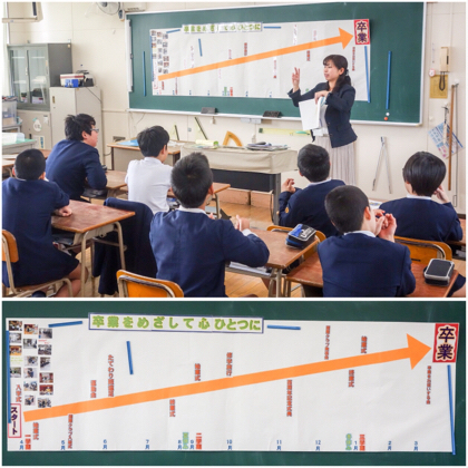 始業式後の学級活動。黒板に大きな予定表が貼り出されていました。