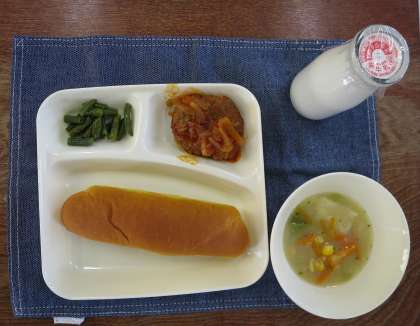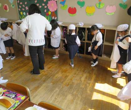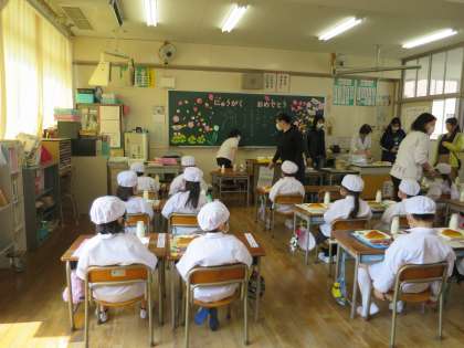 今日から給食が始まりました。1年生にとっては初めての給食!先生に給食時のマナーやエプロンの着方や脱ぎ方を教えていただきました。おいしくっておいしくって、明日からの給食も楽しみです。