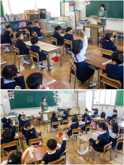 名前を呼ばれたら、手を挙げて「ハイッ!」の返事。続いて、健康観察と持ち物の確認。朝のルーティンです。
